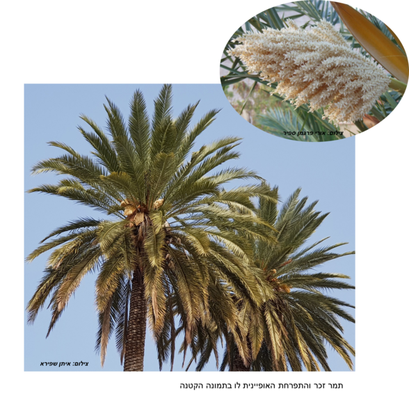 מידע כללי: התמר המצוי (Phoenix Dactylifera) ששמו באנגלית Date Palm הוא מין דו-ביתי. הכוונה לכך שיש עצי נקבה, שהם אלה הנושאים את הפירות המתוקים ועצי זכר שהם אלה המפזרים את האבקה, העלולה לגרום לתסמיני אלרגיה. מקורו של התמר הוא באזורנו אבל בגלל אלפי שנים של גידולו בידי אדם ייתכן שלא נשארו כבר שרידים של צמחי הבר המקוריים ממין זה.