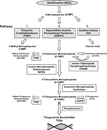 AZA, 6-MP ו-TG-6 הם שלושה prodrugs בלתי-פעילים, המשמשים לטיפול במצבי מחלה מגוונים, שעוברים מטבוליזם על ידי 3 אנזימים שונים והופכים לשלושה נוקלאוטידים פעילים ביולוגית שונים של thioguanine-6. התכשיר azathioprine (להלן AZA) עובר מטבוליזם והופך ל-MP-6, ואילו MP-6 מותמר ל-2 מטבוליטים בלתי-פעילים פרמאקולוגית, thiouric acid-6 על ידי האנזים xanthine oxidase, ו-methylmercapyourine-6 (להלן MMP-6) על ידי האנזים thiopurine S-methyltransferase (TPMT).